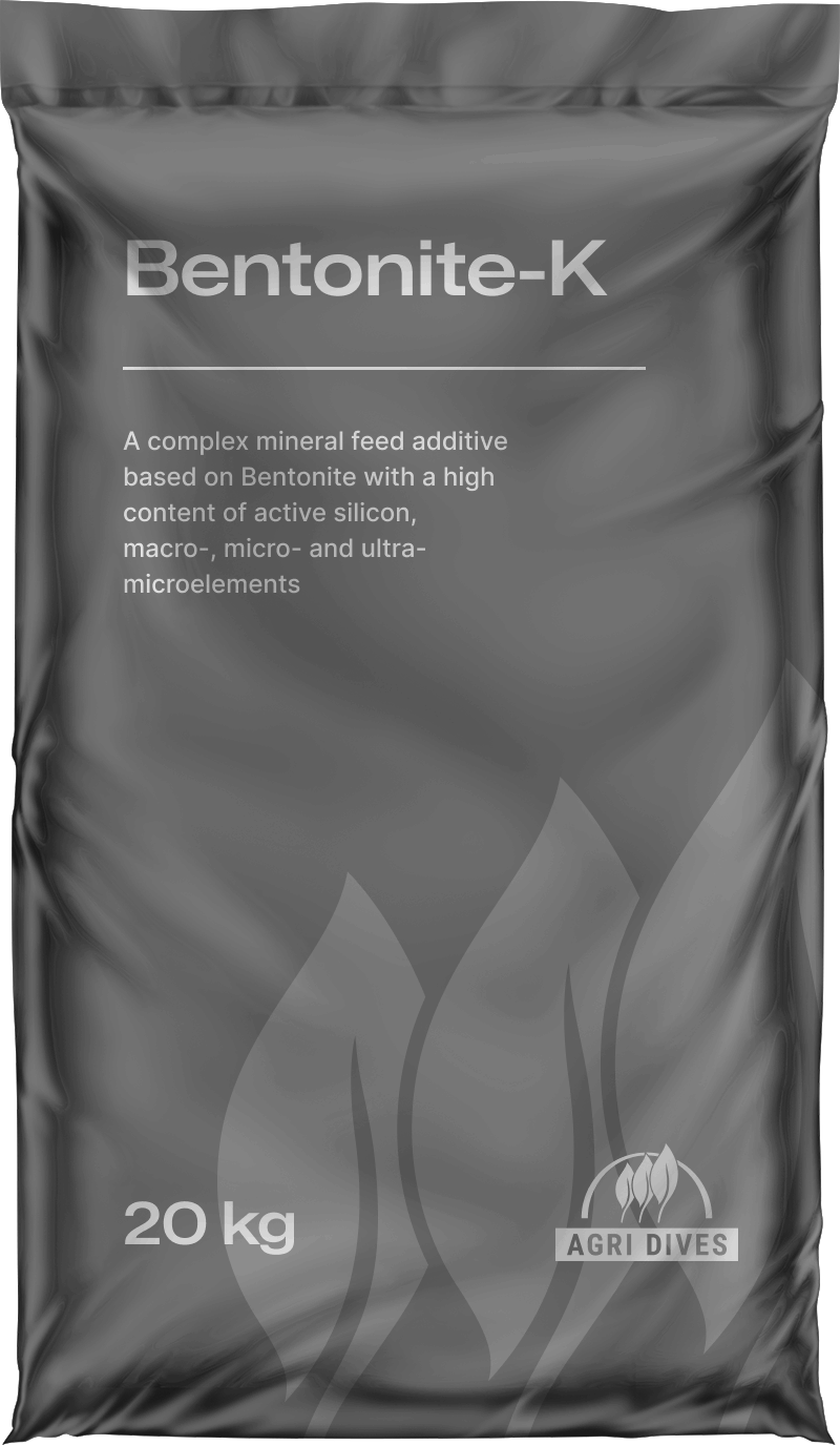Consumption rate of "Bentonite-K CATTLE" for small cattle, pigs is 0.5-2.0% by weight of feed.